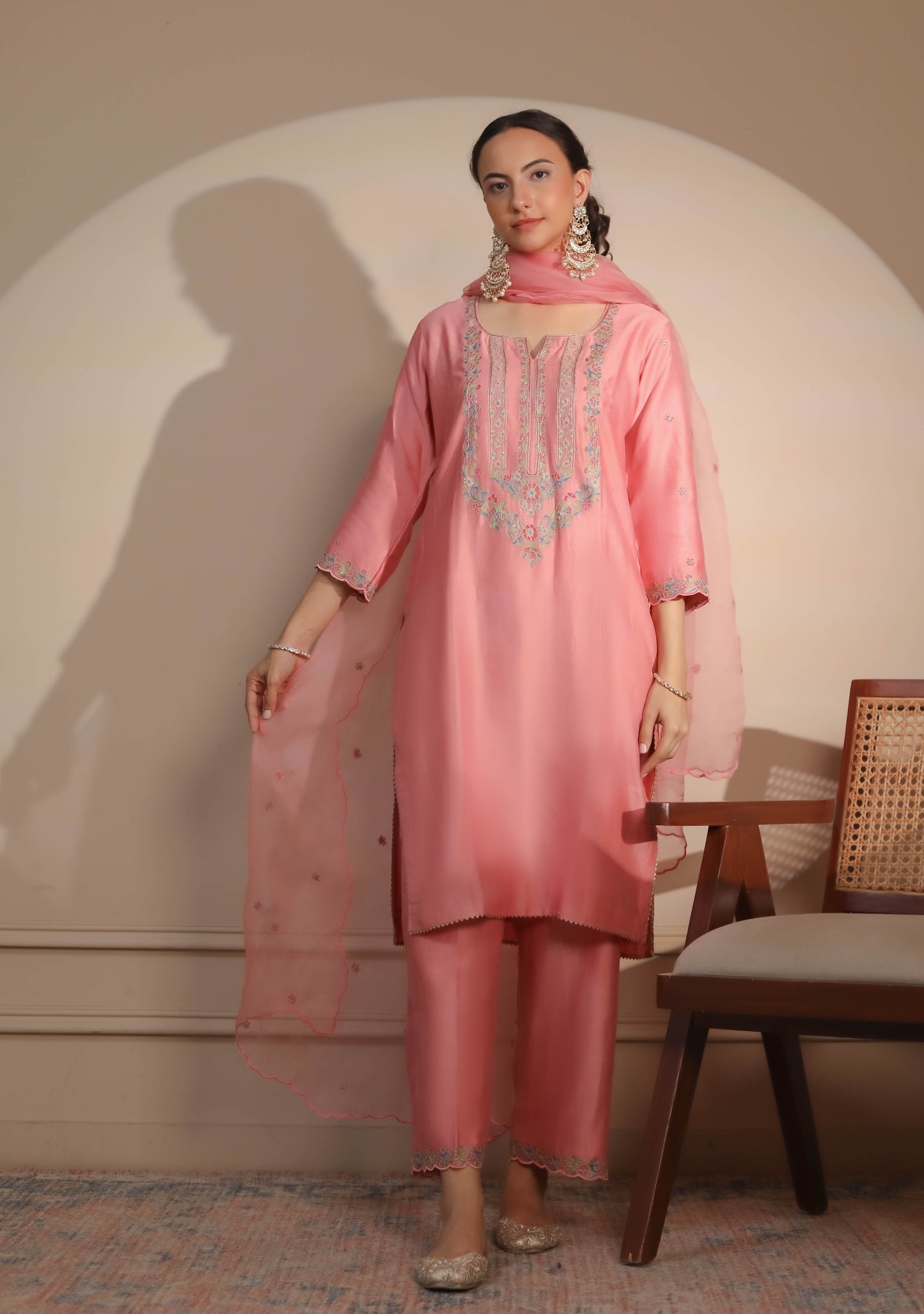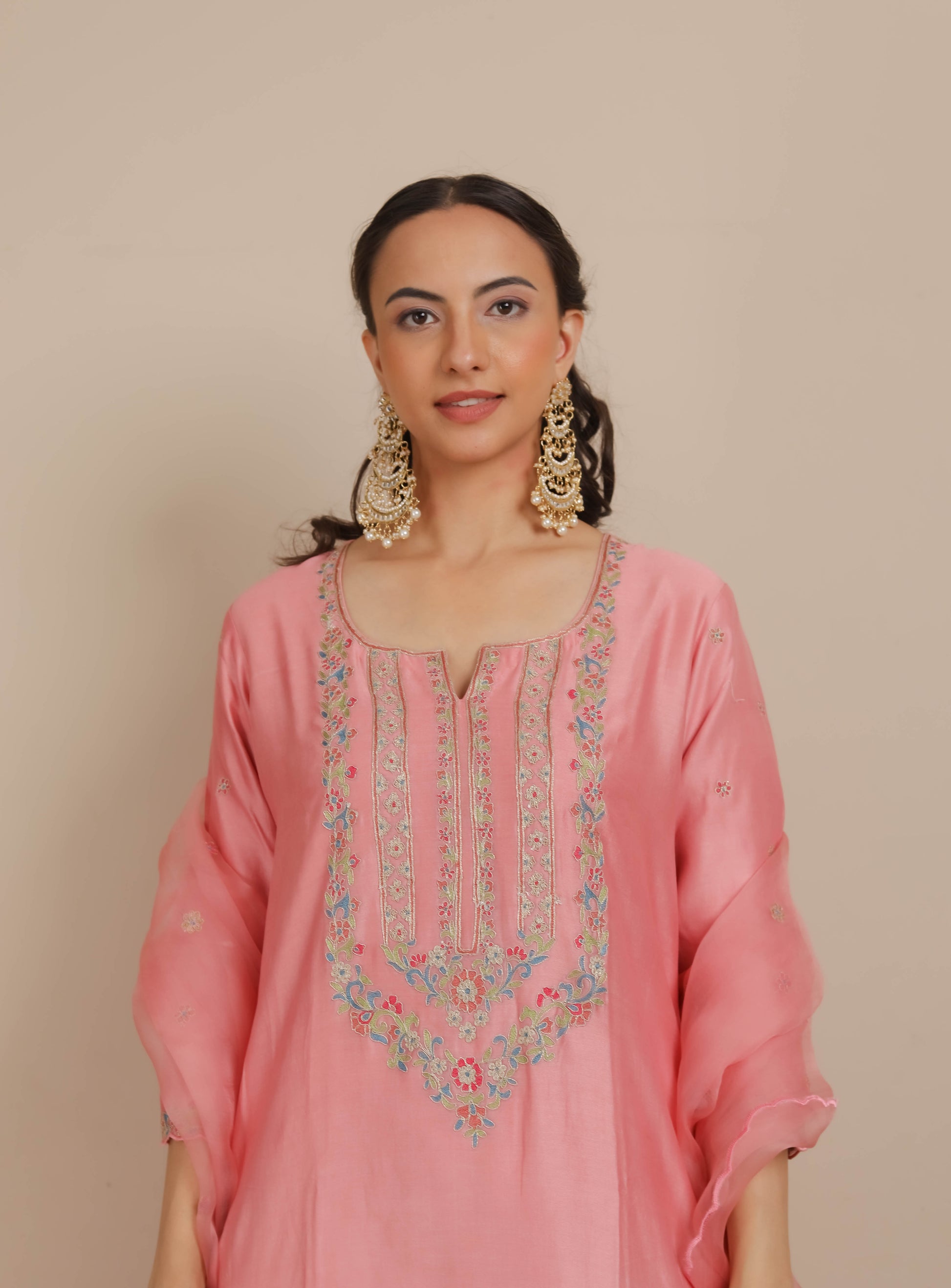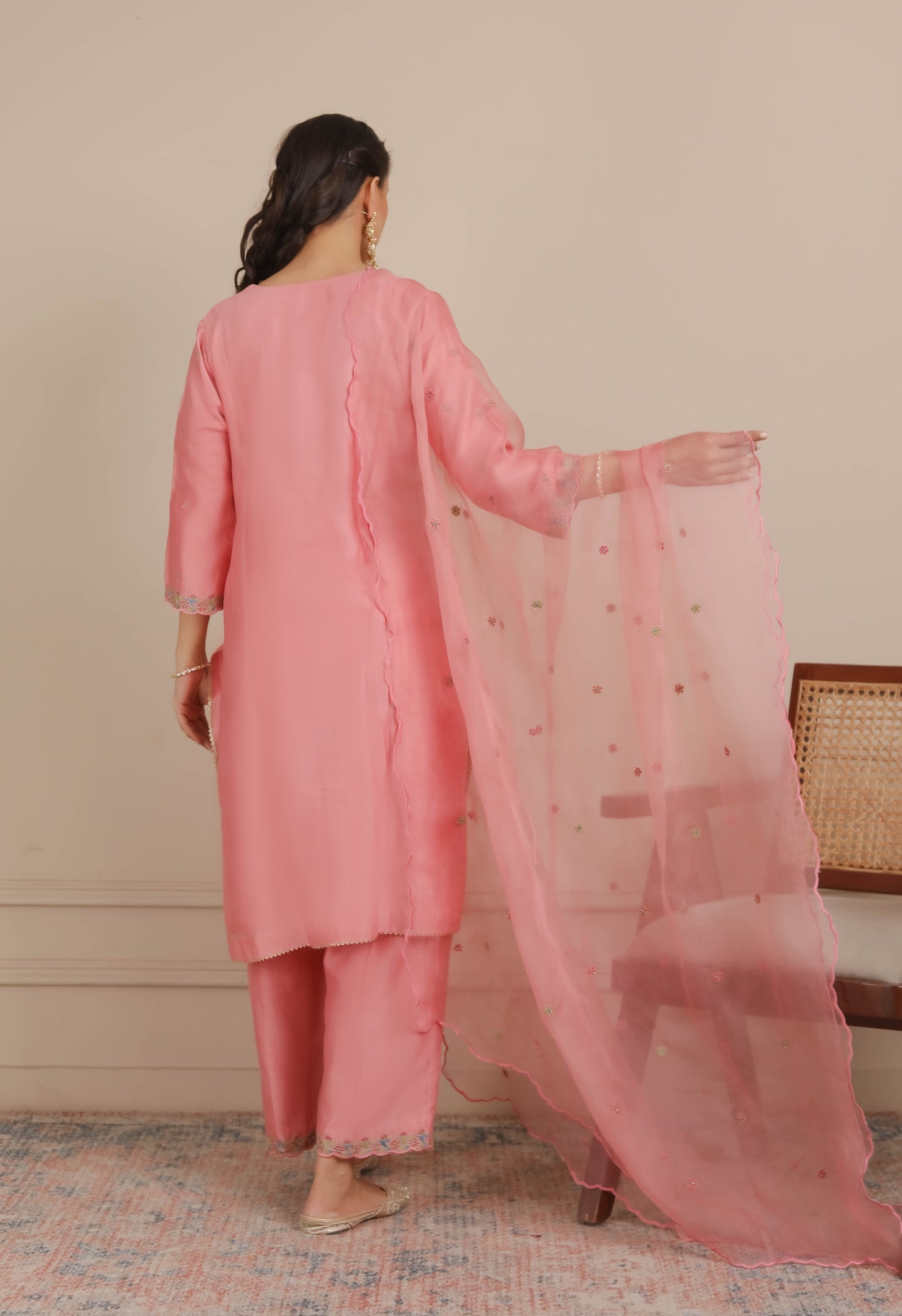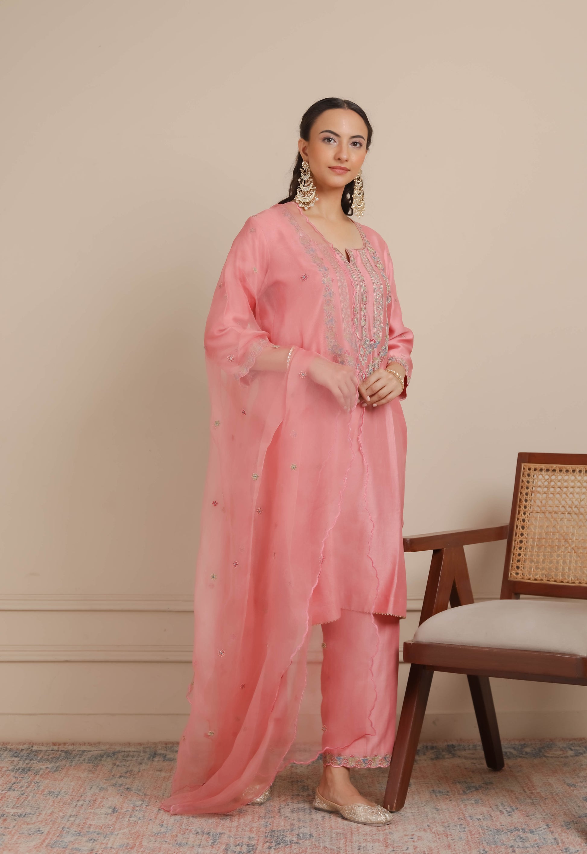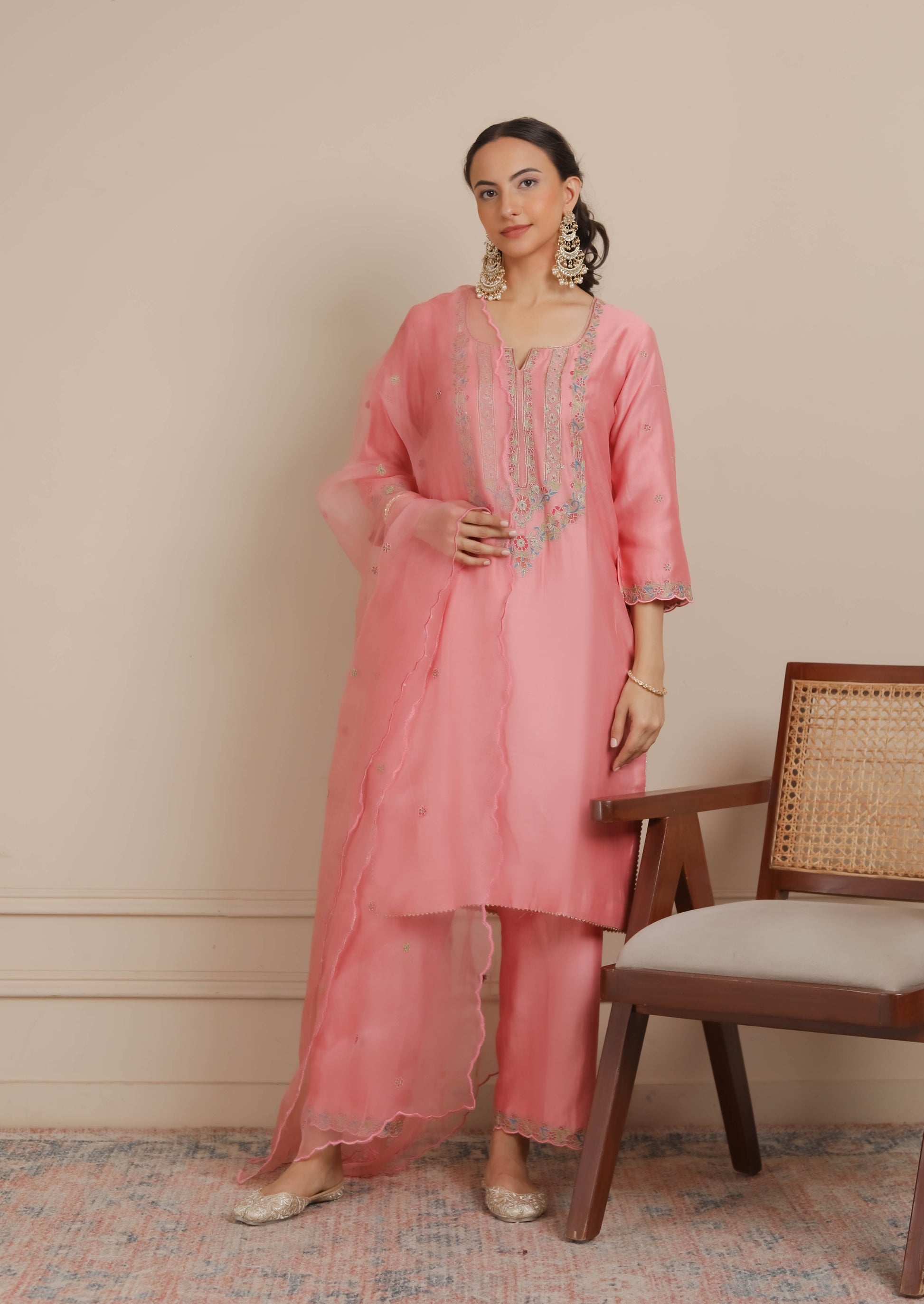 - Pink kurta with dori and colored thread embroidery on the neckline and sleeves with Salwar that has embroidery on the hemline. Pair it with an Elegant Scalloped Organza Dupatta with All-Over Floral Booti Embroidery to give Traditional Look