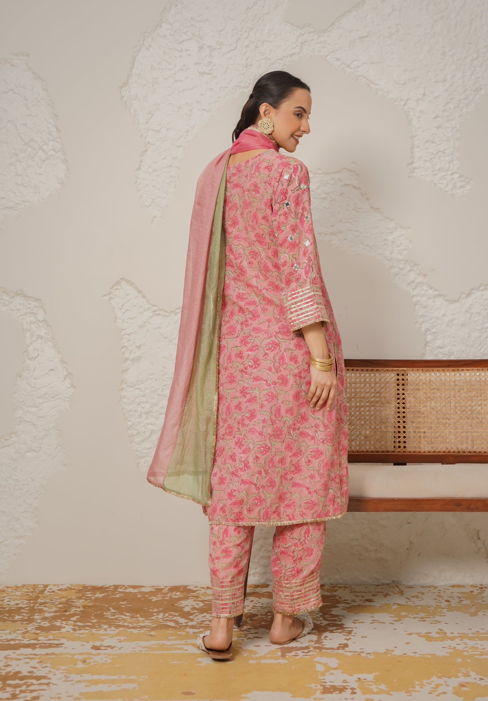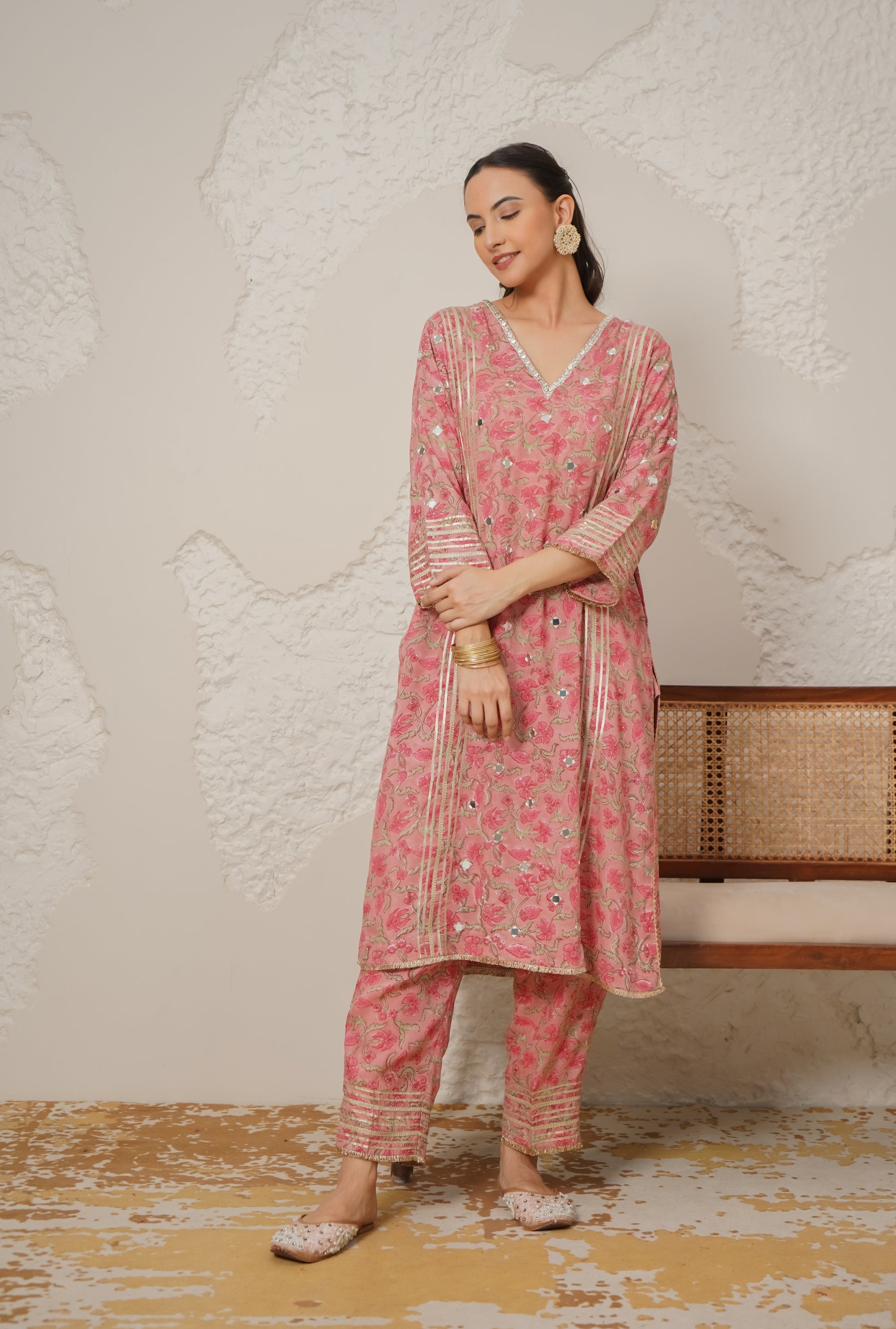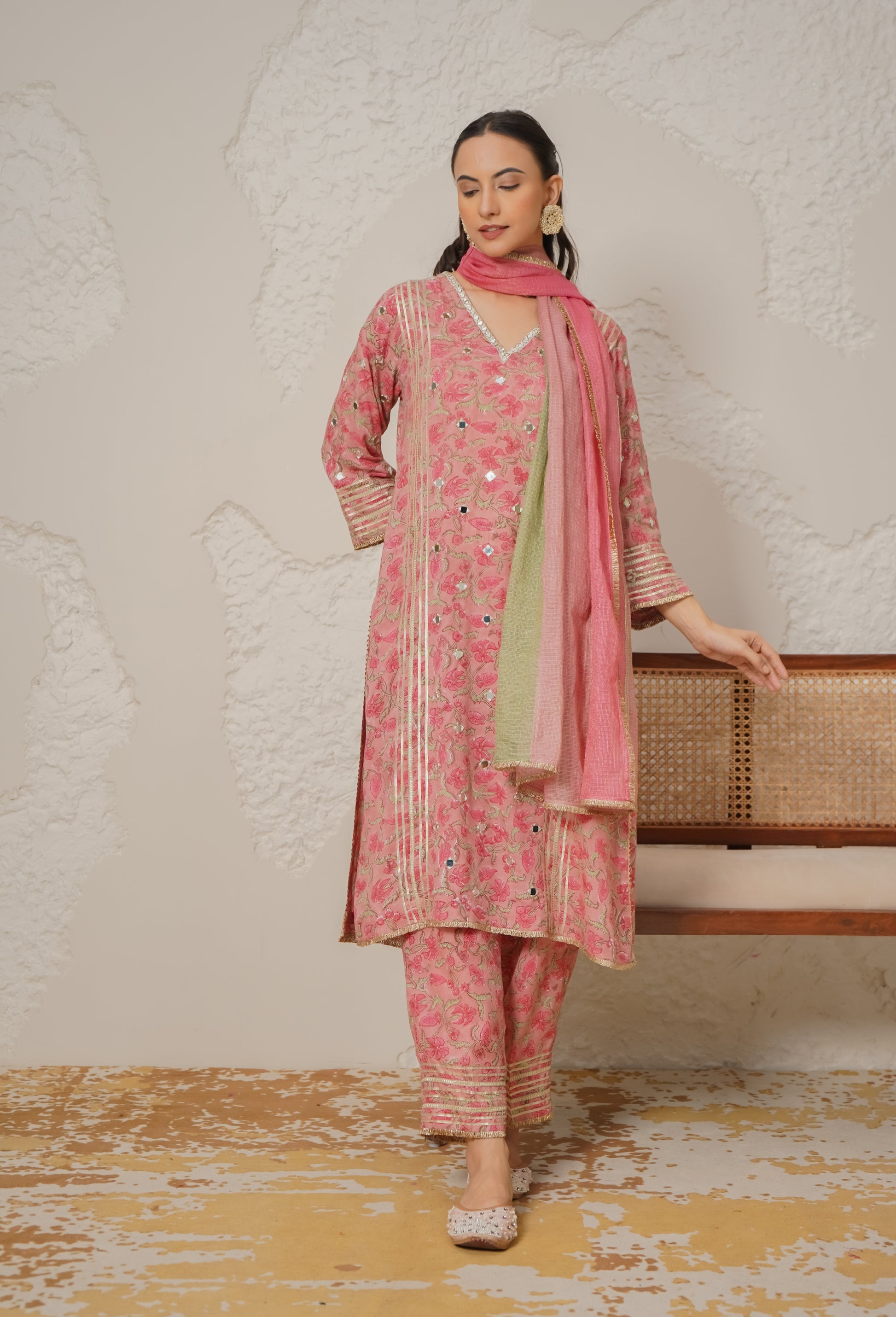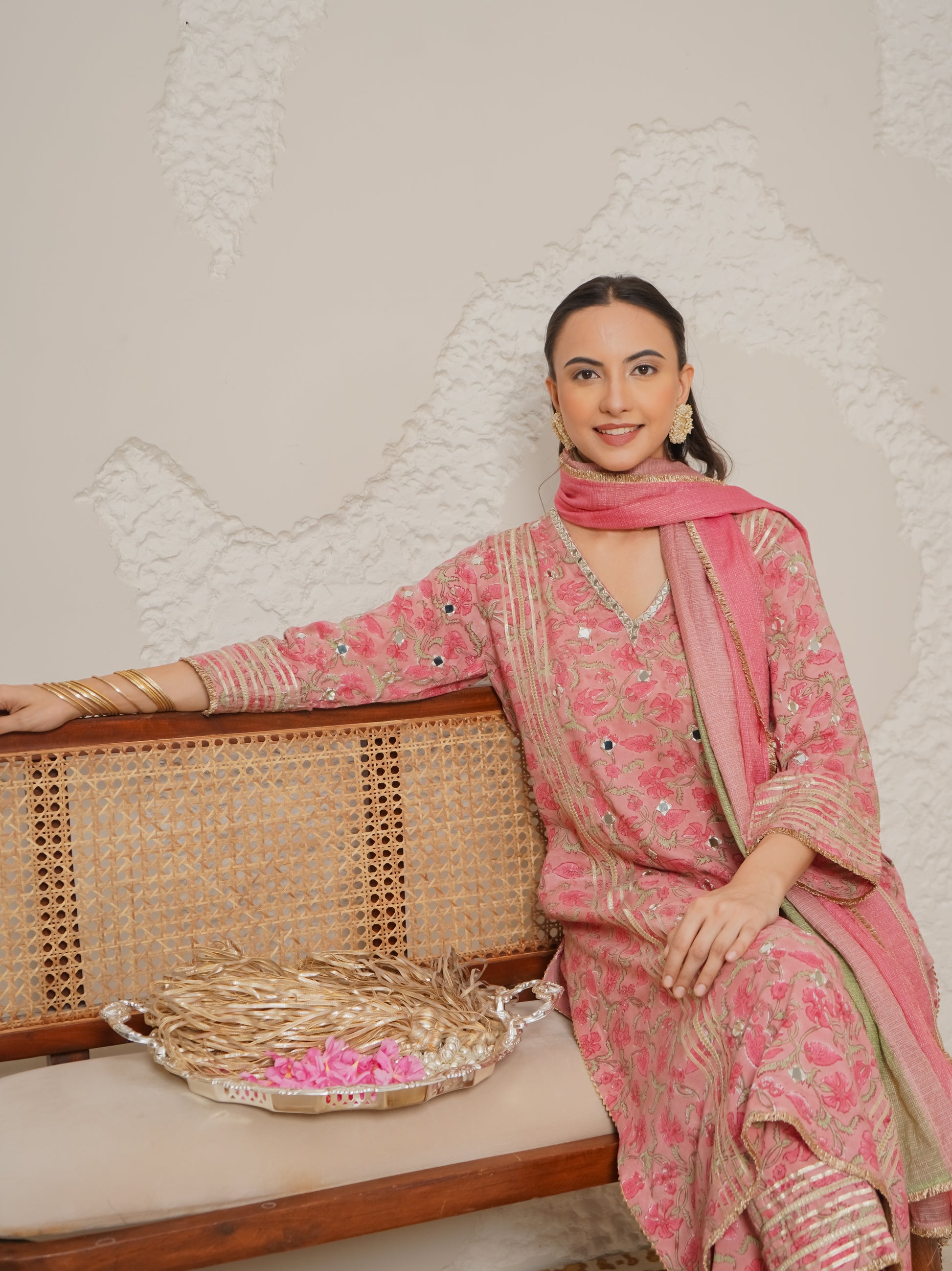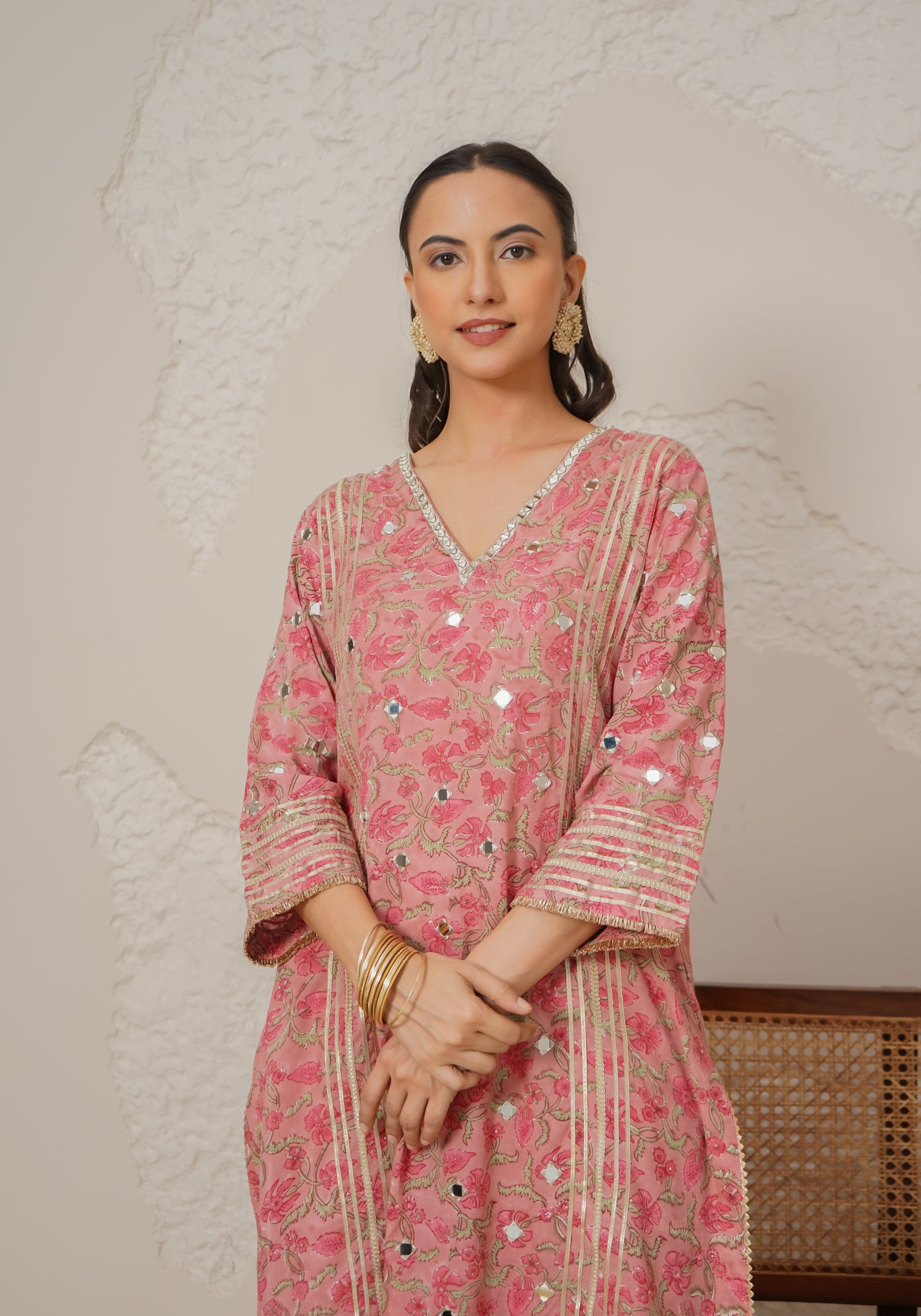 - Product- Featuring Saanjh, a Pink kurta set crafted in hand block-printed Modal cotton, adorned with delicate mirror and gota embroidery. Finished with fringe and gota detailing for a graceful touch. Pair it with our elegant colour-block Kota Zari dupatta, with a fringe border and intricate gota accents, to complete the traditional look.